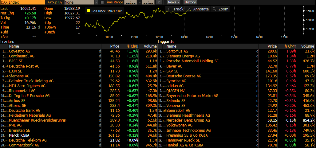 Covestro et Continental sont les entreprises les plus solides de l'indice DAX. Dans le même temps, les plus faibles sont Siemens Energy et Sartorius qui perdent respectivement 1,3 et 1,9%. Source: Bloomberg Finance LP