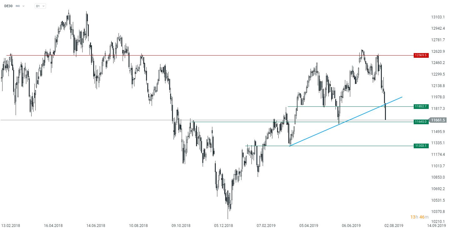 En regardant le graphique journalier du DE30, on peut remarquer que les prix ont commencé la journée en baisse substantielle et qu'ils se négocient actuellement en dessous de l'important support technique situé à proximité des 11850 points. Si les prix restent au-dessous de cette zone jusqu'à la fin de la journée, on peut s'attendre à ce que les baissiers l'emportent dans les prochains jours. Cela correspondrait au sentiment morose des marchés suscité par Donald Trump la semaine dernière. Les niveaux de support suivants peuvent être trouvés à 11640, puis 11300 points. Source: xStation5