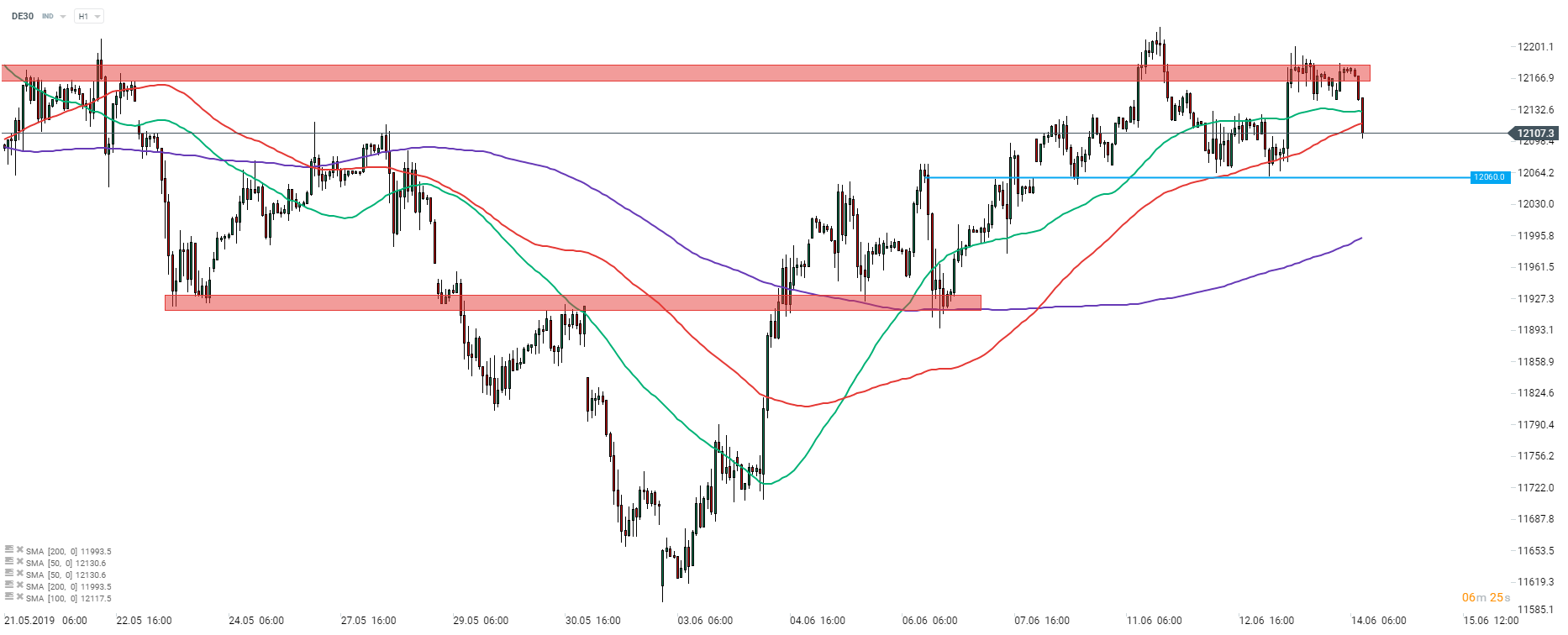 Le DE30 recule suite à l’échec de l’indice à franchir la zone de résistance allant de 12 165 à 12 185 pts. L'indice est tombé en dessous de la moyenne mobile sur 50 et 100 périodes (H1, lignes verte et rouge). Source: xStation5