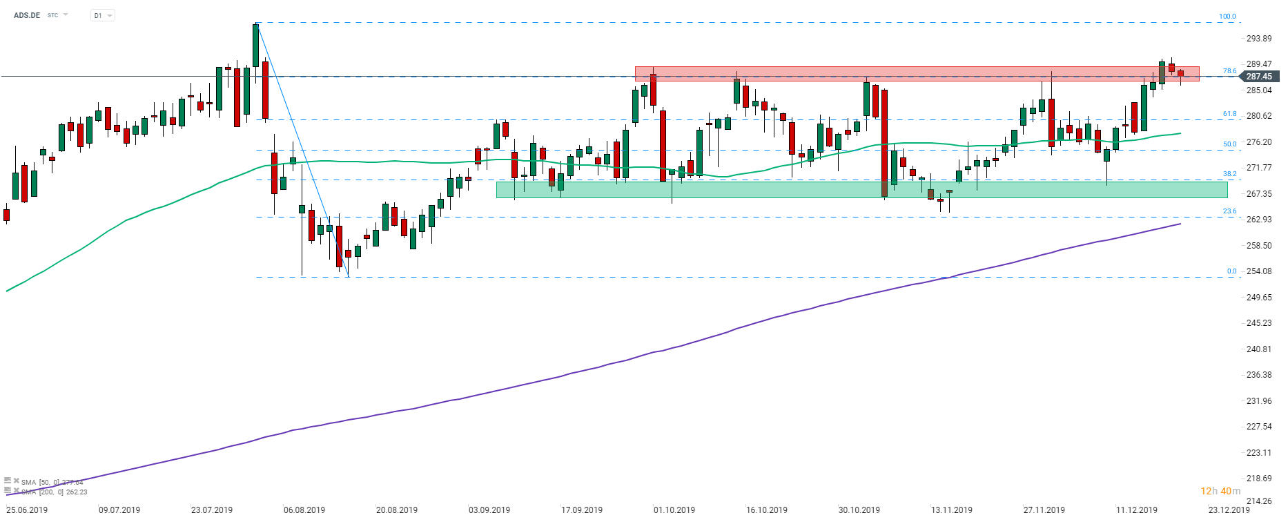 Adidas (ADS.DE) s'est replié de son sommet historique au début du mois d'août 2019. Le titre a réussi à se redresser un peu plus tard mais s'est enfermé dans un mouvement latéral entre les niveaux de retracement de 38,2 % et 78,6 % de la correction du mois d'août. Le titre tente de franchir la limite supérieure de la fourchette et dans le cas où il y parviendrait, un test des sommets à 296 € pourrait être envisagé. Source : xStation5