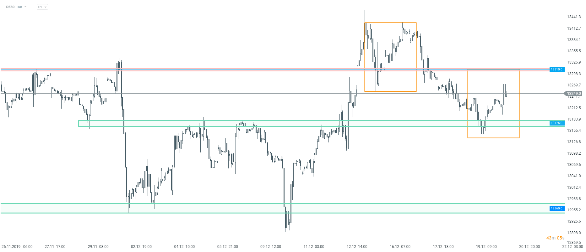 Le DE30 a sous-performé de manière significative cette semaine mais a réussi à stopper le repli proche de la zone de support autour des 13175 pts. Un point à noter est que cette zone est également marquée par la limite inférieure de la structure du Overbalance. L'indice allemand a rebondi sur cet obstacle au cours de la nuit et s'est redressé. Le mouvement vers le haut s'est arrêté légèrement en dessous des 13300 pts. L'indice recule pour le moment mais dans le cas où les haussiers parviendraient à reprendre le contrôle du marché, on ne peut exclure un test de la zone de résistance autour des 13310 pts. Cette résistance marque également la limite supérieure de la structure Overbalance ; une rupture au-dessus de cette limite pourrait donc laisser présager un renversement de tendance à court terme.
