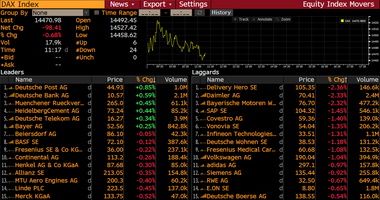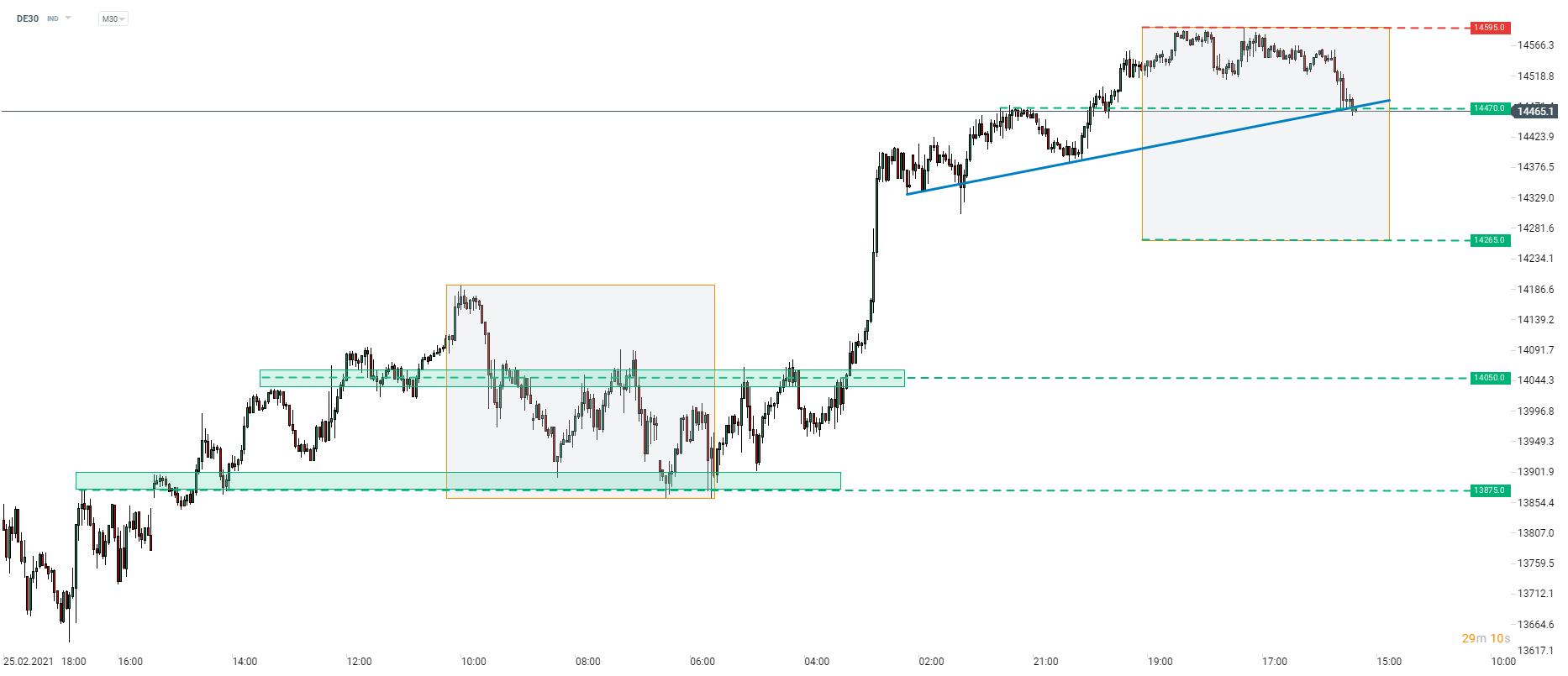 Le DE30 a atteint un nouveau record historique juste un peu en dessous de la barre des 14 600 pts. Cependant, l'indice s'est replié aujourd'hui après que les humeurs aient commencé à se détériorer au cours de la session asiatique. Le DE30 s'est replié et teste actuellement un support clé de court terme dans la zone des 14 470 pts. La zone est marquée par le sommet de court terme de mardi soir ainsi que par la ligne de tendance haussière à court terme. Une cassure en dessous de cet obstacle ouvrirait la voie vers la limite inférieure de la géométrie de marché à 14 265 pts. En cas de franchissement de ce niveau, la baisse pourrait s'accentuer en direction des 14 050 pts.