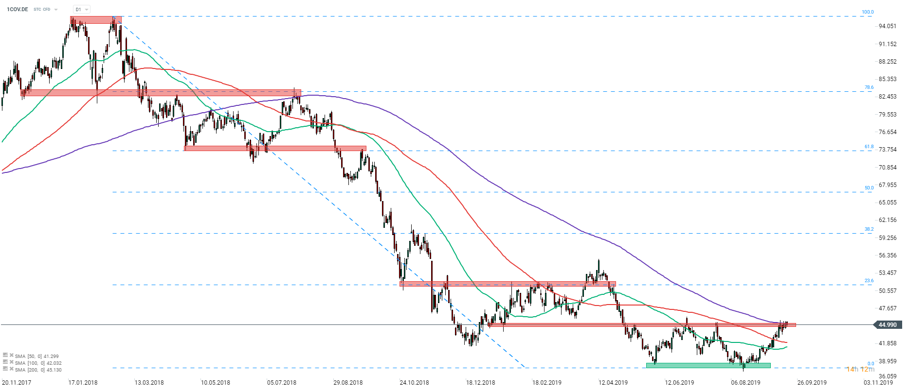 Les actions de Covestro (1COV.DE) ont lancé un important mouvement à la baisse après avoir peint un double top près de 95 € au premier trimestre 2018. Les actions se négocient à plus de 50% après 18 mois, mais le titre a augmenté depuis le mois dernier. environ 20%. Le prix recule actuellement après avoir omis de percer au-dessus du seuil de 45 €, où se trouvent un mélange de moyenne mobile à 200 périodes (ligne violette) et de zone de résistance clé. Source: xStation5