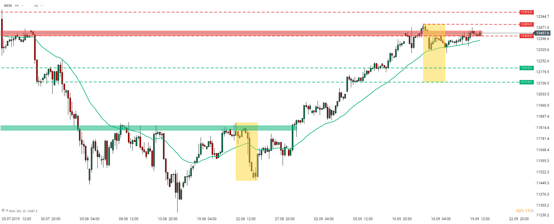Le DE30 a réussi à dépasser la zone de résistance située entre 12420 et 12450 pts hier, mais n'a pas réussi à ce maintenir au-dessus de cette zone. Un repli s'est produit plus tard, mais la limite inférieure de la zone (12420 pts) a réussi à repousser les vendeurs. La direction d’une rupture de la zone sera cruciale à court terme, mais gardez à l’esprit que la tendance reste à la hausse tant que le prix reste au-dessus de la limite inférieure de la structure Overbalance (12115 pts, boîte jaune). En cas de rupture de la zone, les traders devraient se concentrer sur l’un des deux niveaux: support de la moyenne mobile exponentielle sur 33 périodes (12390 pts, ligne verte sur l’intervalle H4) et la résistance marquée par le plus haut de cette semaine (12495 pts).