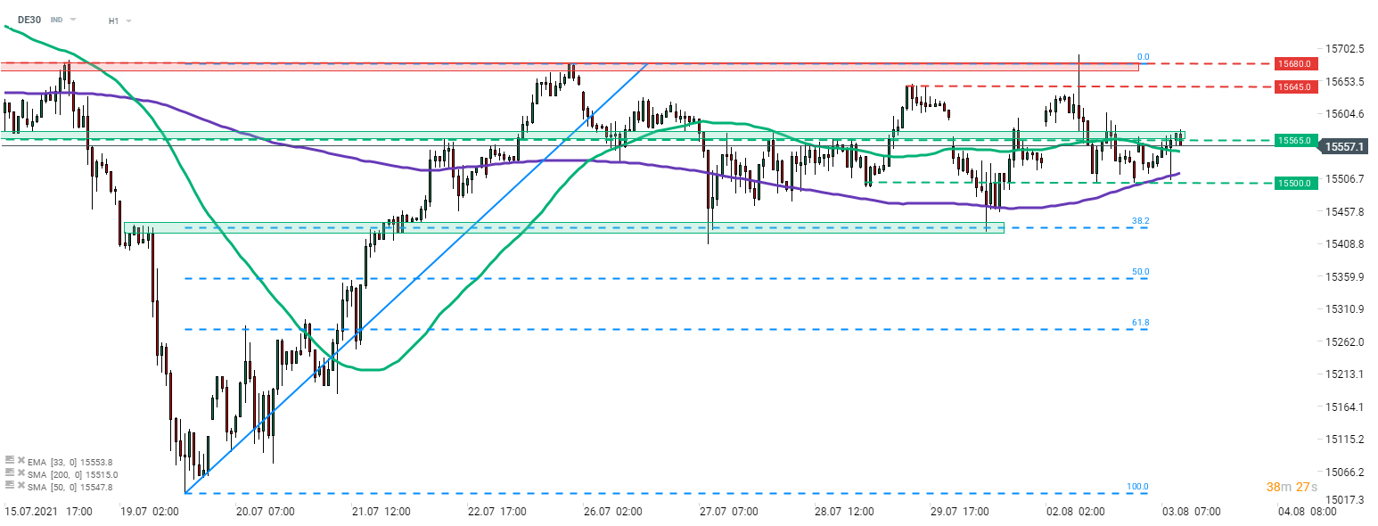 Le DE30 a stoppé le sell-off d'hier au niveau de la moyenne mobile de 200 heures dans la zone des 15 500 pts. L'indice s'est redressé et tente à nouveau de franchir la résistance de 15 565 points. Si les acheteurs ne parviennent pas à pousser le cours au-dessus de cette résistance, un repli vers la zone des 15 500 points susmentionnée pourrait être la prochaine étape. Aucune publication macroéconomique majeure n'est prévue aujourd'hui, la session à venir pourrait donc être plutôt calme. La zone des 15 645 pts est la zone de résistance à surveiller en cas de cassure au-dessus des 15 565 pts.