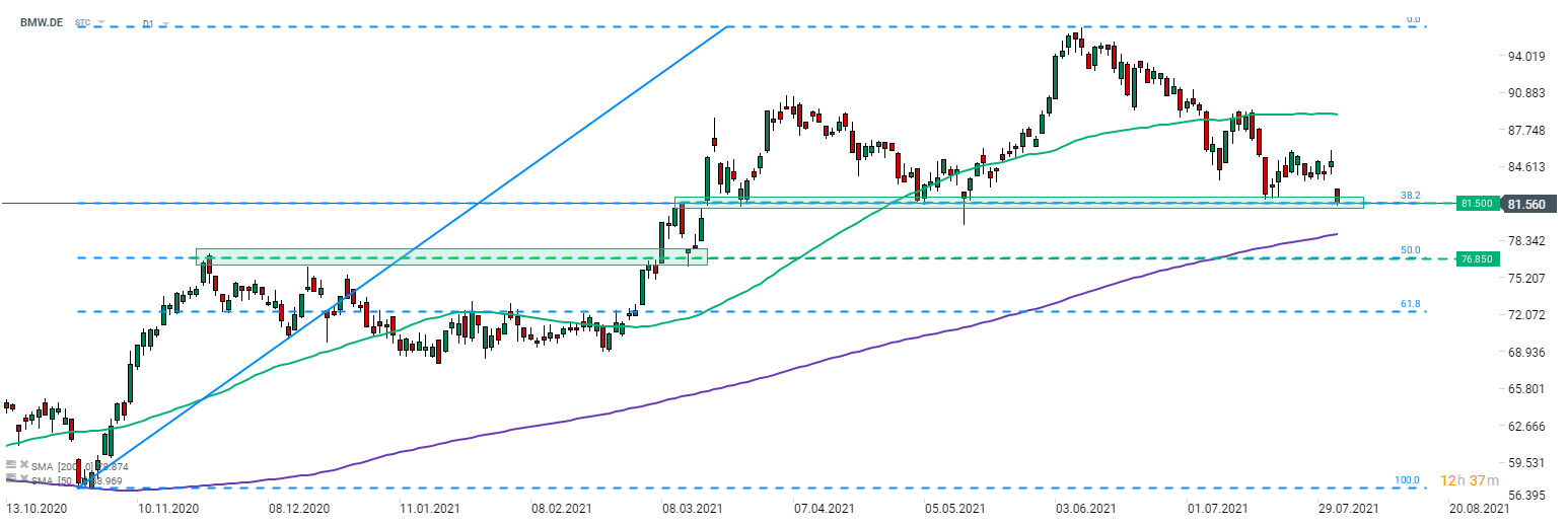 BMW (BMW.DE) s'échange en baisse après la publication des résultats du deuxième trimestre 2021. Les actions ont commencé la séance d'aujourd'hui en baisse et testent maintenant la zone de support située autour du retracement à 38,2% de l'impulsion haussière amorcée fin octobre 2020 (81,50 €). Une cassure sous cette zone ouvrirait la voie à un test de la moyenne mobile à 200 séances dans la zone des 79 € (ligne violette). Source : xStation5