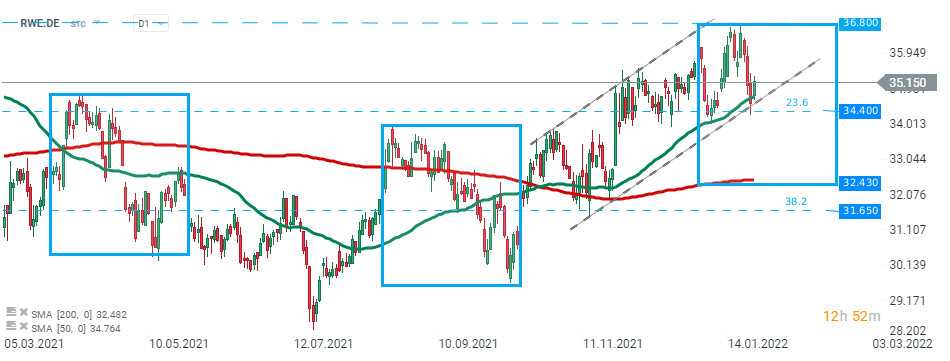 L'action RWE (RWE.DE) a fortement chuté cette semaine, mais les acheteurs sont parvenus à stopper la baisse autour de la zone de support majeure à 34,40 €, marquée par le retracement de Fibonacci à 23,6 % de la vague de hausse amorcée en mars 2020, la limite inférieure du canal ascendant et la SMA 50 (ligne verte). Si les acheteurs parviennent à maintenir leur élan, une autre impulsion à la hausse vers les récents sommets de 36,80 € pourrait être initiée. D'autre part, en cas de cassure sous le support susmentionné, la prochaine cible pour les vendeurs se situe à 32,43 € et coïncide avec la SMA 200 (ligne verte) et la limite inférieure de la structure 1:1. Source : xStation5