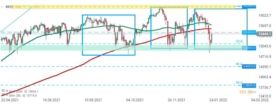 Le DE30 a commencé la séance d'hier en baisse, mais les acheteurs ont réussi à reprendre le contrôle dans l'après-midi et à effacer la plupart des pertes initiales. L'indice a rebondi sur le support psychologique à 15 000 pts qui est marqué par la limite inférieure de la structure 1:1 et s'approche actuellement de la résistance de court terme à 15 500 pts qui coïncide avec la SMA 200 (ligne rouge). Source : xStation5