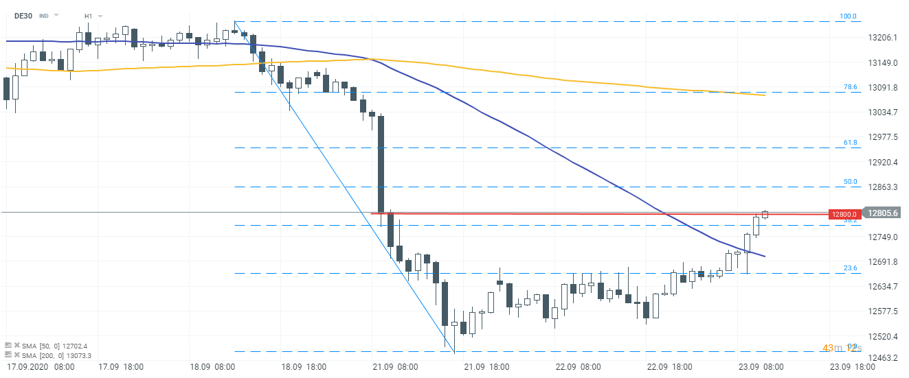 Pour la deuxième journée consécutive, le DE30 a tenté de se remettre de la récente baisse des marchés. L'indice a dépassé la moyenne mobile à 50 heures (ligne violette) au début de la séance d'aujourd'hui (à noter que le DE30 a également réussi à dépasser le retracement de 38,2 % de Fibonacci). L'indice teste actuellement la zone des 12 800. Si le sentiment du marché devait s'inverser, la moyenne mobile de 50 heures mentionnée pourrait être considérée comme un niveau de support à court terme.