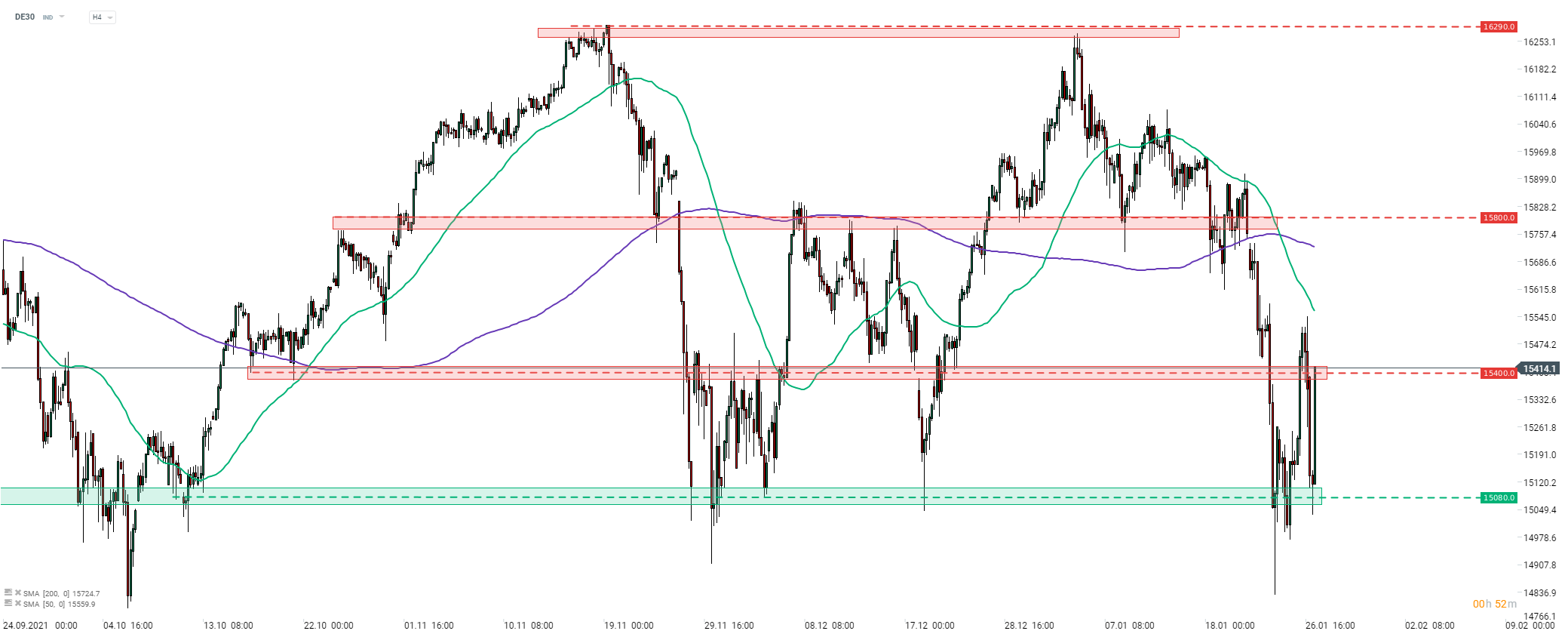 Le DE30 était en passe de franchir la résistance de 15 400 pts hier, mais la Fed a altéré l'humeur du marché. L'indice a plongé vers le support de 15 080 pts, sur lequel la baisse a été stoppée. Un mouvement de reprise a été lancé au début de la séance d'aujourd'hui et l'indice teste à nouveau la résistance de 15 400 pts susmentionnée. Cependant, la possibilité d'une cassure de cette résistance à la hausse dépend du rapport sur le PIB américain pour le quatrième trimestre 2021 qui sera publié aujourd'hui à 14h30. Source: xStation5