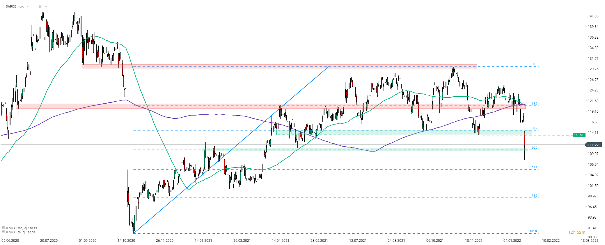 SAP (SAP.DE) est l'entreprise la moins performante de l'indice allemand aujourd'hui. L'action a chuté car les prévisions pour 2022 ont été jugées quelque peu décevantes. Le cours de l'action a plongé sous la zone de support comprise entre 113,50 € et le retracement à 38,2 % de la hausse entamée en novembre 2020 et teste actuellement le prochain support au niveau du retracement à 50 % (zone de 110,00 €). Source: xStation5
