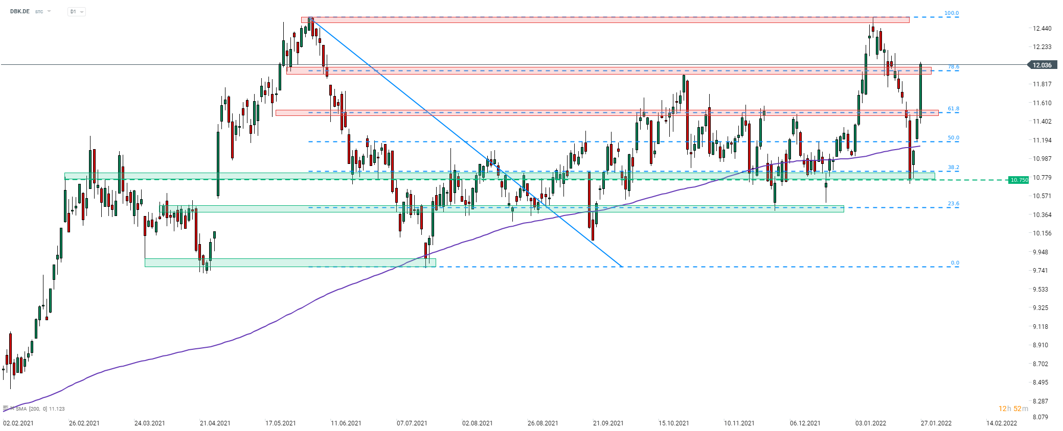 La Deutsche Bank (DBK.DE) est l'entreprise du DAX la plus performante aujourd'hui. L'action progresse après la publication de résultats optimistes pour le quatrième trimestre. Le prêteur allemand a fait état d'un bond de 8,2 % en glissement annuel de ses revenus au quatrième trimestre, à 5,9 milliards d'euros (contre 5,68 milliards d'euros), et d'un bénéfice net de 145 millions d'euros. Les revenus provenant des activités de trading ont légèrement diminué d'une année sur l'autre, à 1,2 milliard d'euros. Pour l'ensemble de l'année, le revenu a bondi de 6 % pour atteindre 25,3 milliards d'euros. Il s'agit du meilleur résultat net réalisé par l'entreprise depuis 2011. La banque a annoncé son intention de verser 700 millions d'euros aux investisseurs par le biais de rachats et de dividendes. La société a également annoncé qu'elle prévoit désormais de dépasser sa précédente prévision de 25 milliards d'euros de revenus pour 2022.