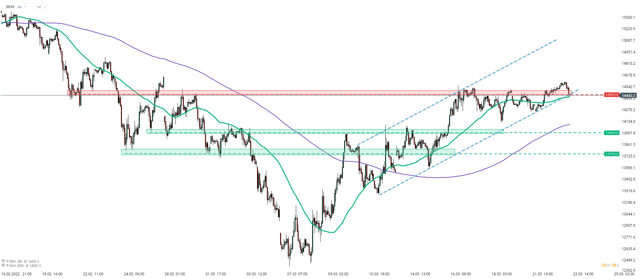 Le DE30 a atteint aujourd'hui son plus haut niveau depuis le début de l'invasion russe en Ukraine, s'échangeant brièvement au-dessus des sommets des 16-17 mars 2022. Néanmoins, les acheteurs n'ont pas réussi à conserver ces gains et un repli a été amorcé. L'indice a effacé tous les gains de la matinée et s'échange désormais en légère baisse sur la journée. Un regard sur le graphique nous montre que le DE30 pourrait avoir atteint une zone importante - la zone des 14 450 pts marquée par les réactions précédentes des prix, la moyenne mobile sur 50 heures et la borne inférieure du canal ascendant. Une cassure en dessous de cet ensemble de supports pourrait ouvrir la voie à une baisse plus importante.