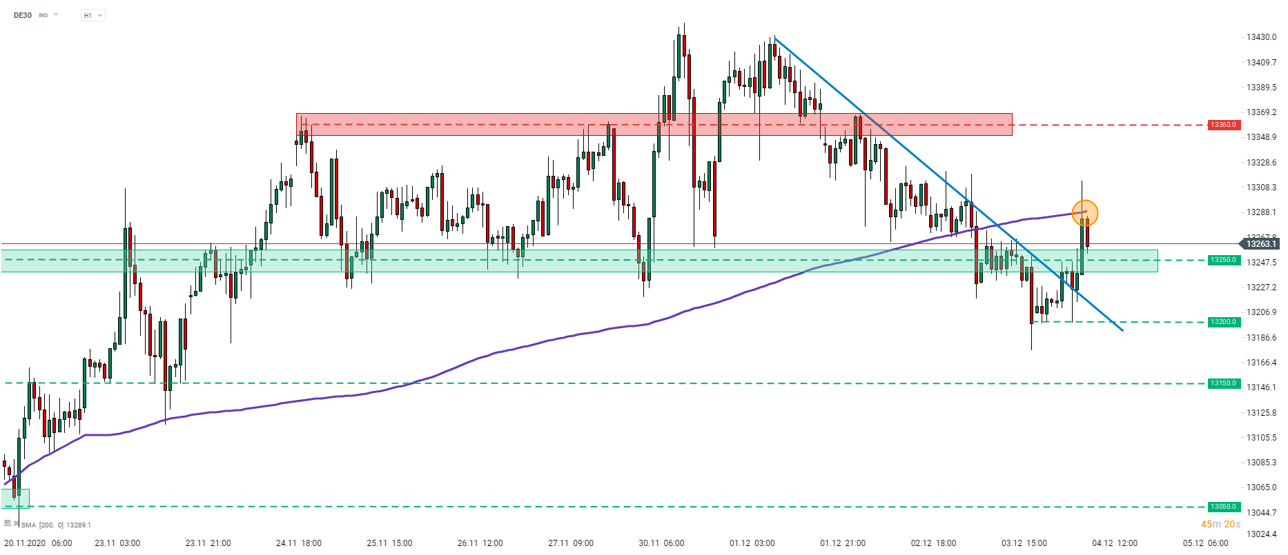 Le DE30 a réussi à réaliser une forte remontée aujourd'hui dans la matinée. À son tour, l'indice a franchi la ligne de tendance baissière à court terme. Le DE30 a stoppé la hausse à la moyenne mobile de 200 heures (ligne violette) et a commencé la correction. Toutefois, à moins que l'indice ne repasse sous la zone de support à 13 250 pts, les acheteurs ne devraient pas être alarmés. Si cela devait se produire, le récent creux à environ 13 200 pts serait un niveau à surveiller. Une cassure en dessous de ce niveau indiquerait la poursuite d'un mouvement de baisse.