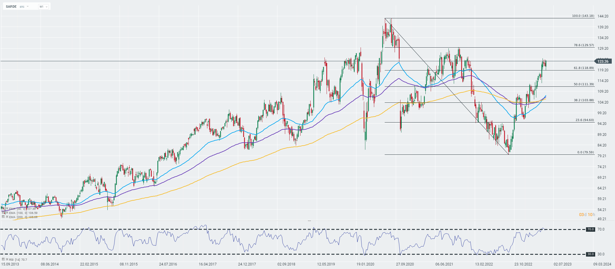 SAP (SAP.DE) prévoit de mener un programme de rachat d'actions d'une valeur maximale de 5 milliards d'euros et relève ses prévisions de revenus pour 2025 à 37,5 milliards d'euros (il était auparavant de 35 milliards d'euros). Le programme de rachat d'actions lui-même devrait démarrer au second semestre 2023. La situation autour de l'entreprise semble s'améliorer malgré la perspective d'un affaiblissement de l'économie mondiale. La société devrait renforcer significativement sa rentabilité, comme en témoigne sa prévision maintenue d'une croissance annuelle de 20% du FCF (free cash flow) entre 2022 et 2025.