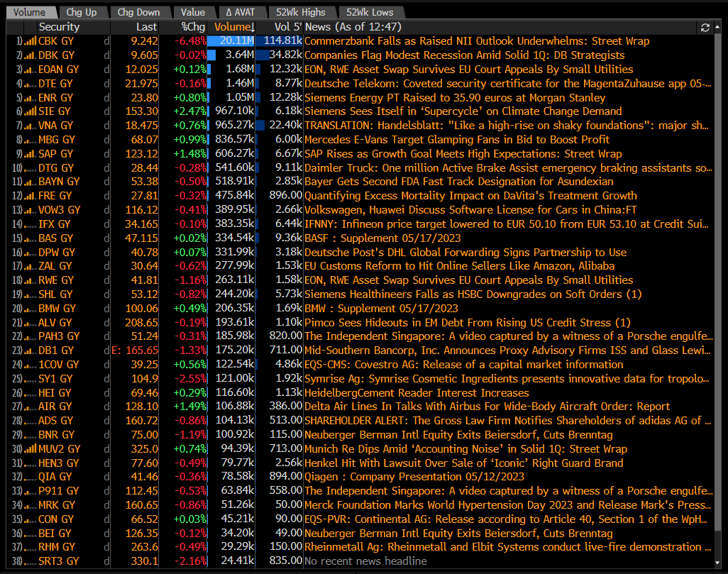 Changements majeurs en pourcentage et nouvelles des sociétés individuelles de l'indice DAX. Source : Bloomberg