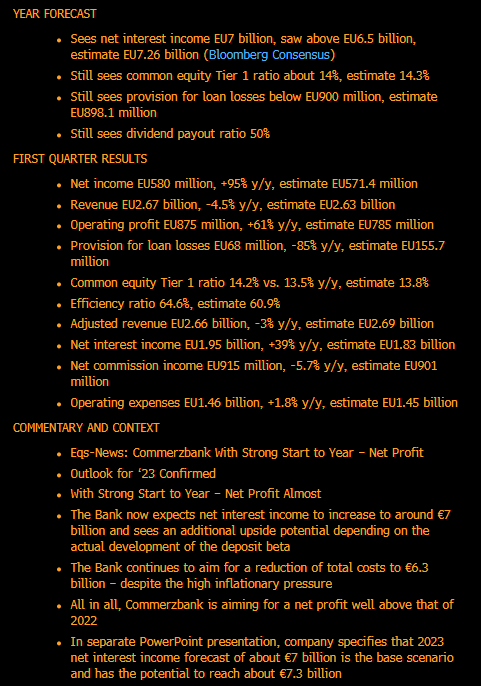 Résultats trimestriels détaillés et perspectives de Commerzbank (CBK.DE). Source : Bloomberg