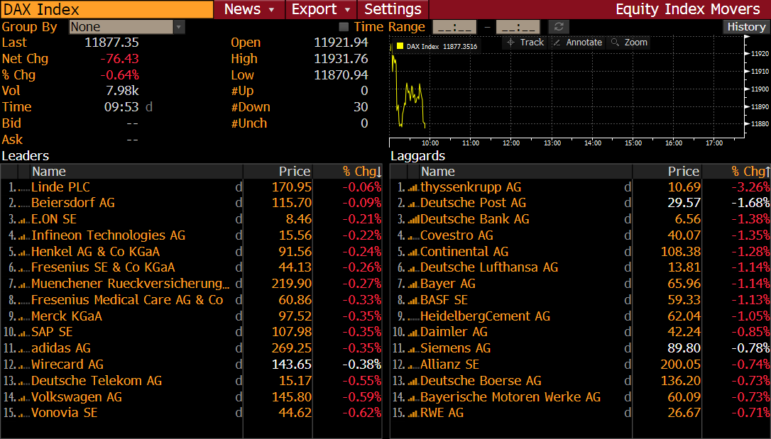 Après la première heure de trading, le DAX allemand recule de 0,5% alors que ses pairs ne font pas bien mieux - le CAC40 est en baisse de 0,4%, le EuroStoxx50 en baisse de 0,4%, le FTSE100 est plutôt stable, le FTSE MIB en baisse de 0,2% et l'IBEX35 glisse également de 0,2%. Pour ce qui est des nouvelles de sociétés cotées au DAX, il vaut la peine de se concentrer sur Thyssenkrupp (TKA.DE), car le titre est en baisse de plus de 3% au moment de la rédaction de cet article. La baisse semble avoir quelque chose à voir avec les commentaires de Bank of America et de Morgan Stanley. La première banque a déclaré que, même si elle considère que les sidérurgistes européens sont bon marché, ils sont confrontés à de nombreux défis, ce qui pourrait constituer un «piège à valeur». Quoi qu’il en soit, les analystes de BofA ont maintenu leur appel d’achat pour Thyssenkrupp avec un objectif de prix de 15 EUR (le spot est de 10,7 EUR). À leur tour, Morgan Stanley a fait part de ses commentaires les plus optimistes. La banque a déclaré que Thyssenkrupp avait la possibilité de dégager une valeur significative en restructurant son portefeuille. Les analystes ont ajouté qu’une introduction en bourse dans le secteur des ascenseurs serait un bon point de départ pour libérer du capital afin de restructurer le reste de la société.