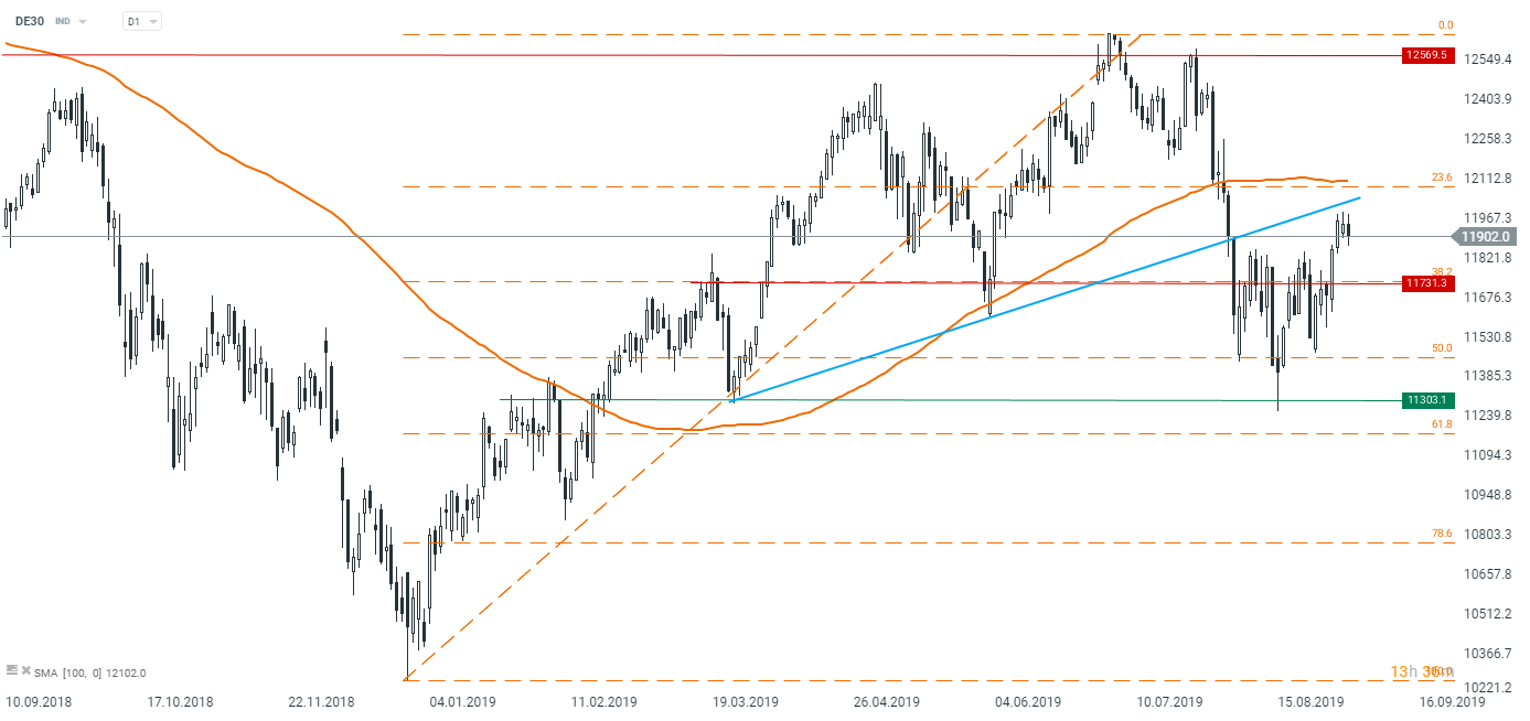Le DAX allemand semble s'orienter à la baisse à court terme. Le prix n'a pas réussi à franchir la ligne de tendance haussière hier, donc une baisse semble être sur la table. Si c'est le cas, un mouvement à la baisse, même vers 11 300 points, semble possible. Source: xStation5