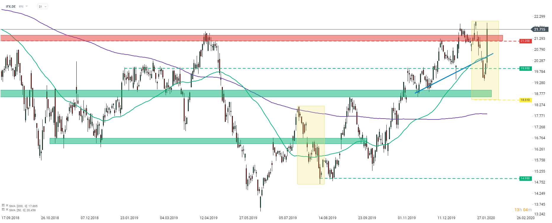 Les actions d'Infineon Technologies (IFX.DE) bondissent aujourd'hui grâce à un solide rapport trimestriel sur les bénéfices. L'action franchit la zone de résistance à 21,20 euros et se situe à 22,10 euros. Si l'action franchit le seuil de résistance, la prochaine grande résistance est la zone de fluctuation à 23,40 euros. Source : xStation5