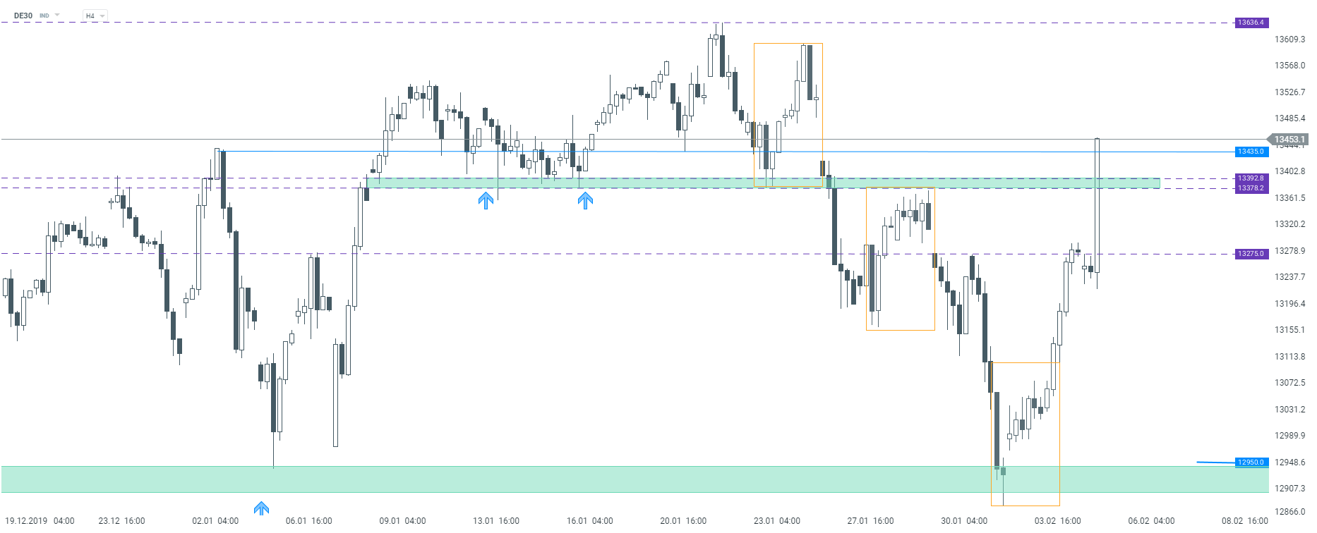 Le DE30 continue à augmenter suite à une rupture au-dessus de la limite supérieure de la structure overbalance (cases jaunes). L'indice progresse fortement aujourd’hui, grâce aux nouvelles sur la découverte présumée d'un traitement efficace contre le coronavirus. Le DE30 dépasse la zone de prix 13378-13392 pts avec un pic permettant de tester les sommets de début janvier (13435 pts). La hausse d'aujourd'hui est très forte, les traders doivent donc rester sur leurs gardes. Un repli pourrait nécessiter un test de la zone de prix susmentionnée comme support et si l'indice casse en dessous, les vendeurs pourraient se diriger vers le niveau de swing à 13275 pts.