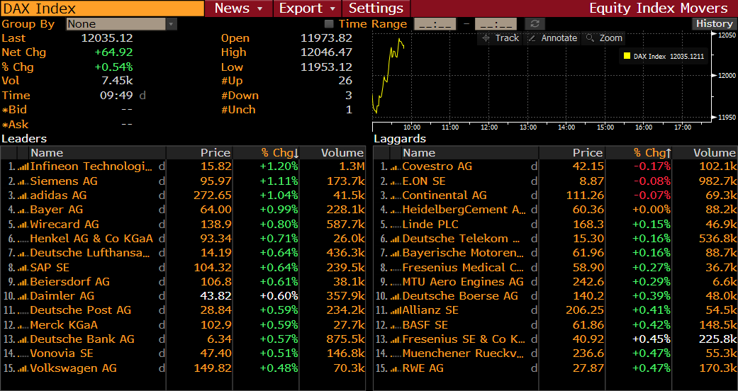 Les membres du DAX à 9h45, heure de Paris. Source: Bloomberg