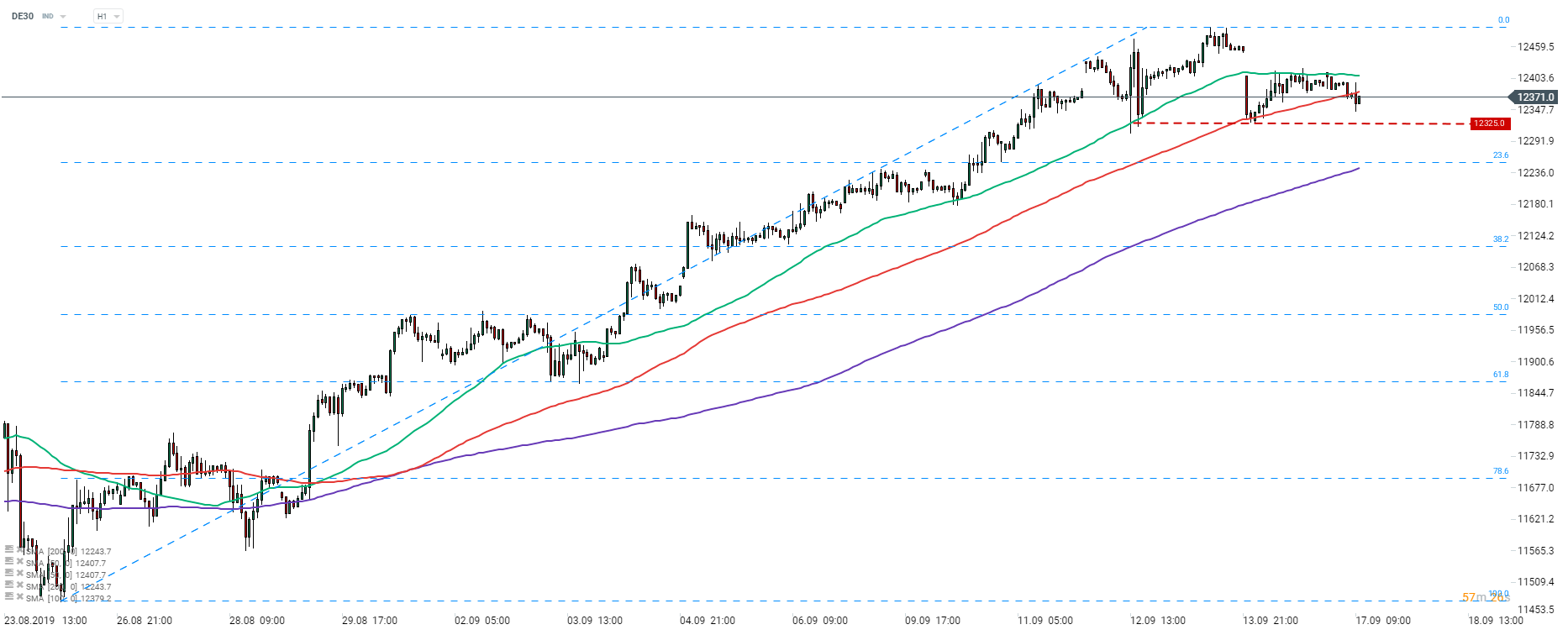 Une hausse à court terme sur le marché boursier allemand a été stoppée cette semaine. La fourchette de négociation d’hier était limitée par deux moyennes mobiles: une SMA de 50 périodes faisant office de résistance (ligne verte) et une SMA de 100 périodes servant de support (ligne rouge). Le DE30 fait une pause en début de séance d’aujourd’hui. Le prochain niveau de soutien à surveiller à court terme est localisé à 12325 pts, soit le plus bas niveau du 12 au 16 septembre. En ce qui concerne les niveaux de résistance à surveiller, il convient de se concentrer sur les deux moyennes mobiles susmentionnées. Notez que lors du récent mouvement haussier, la SMA de 50 périodes a agi comme une ligne de tendance en pente ascendante. Cela dit, cette moyenne mobile peut agir comme une ligne de tendance baissière et une résistance.