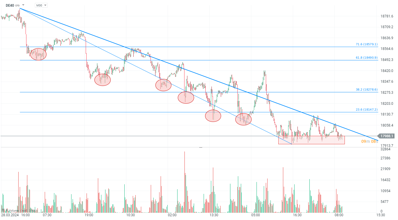 Les contrats à terme sur le DAX tentent de se consolider près de 17.980 points après une vente dynamique. Jusqu'à présent, le volume indique une activité des vendeurs encore plus importante. La première zone importante pour un renversement de tendance à court terme pour les acheteurs est 18.060 et 18.150 points où nous pouvons voir des réactions importantes des prix ainsi que la ligne de tendance et le retracement de 23.6 Fibonacci de la vague descendante de fin avril.