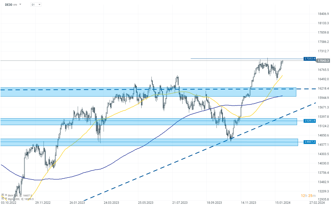 Les cotations du DAX (DE40) s'approchent de leurs plus hauts historiques autour de 17 100 points. Aujourd'hui, l'indice gagne 0,15 % pour atteindre 17 050 points. Si les cotations clôturent aux niveaux actuels, nous enregistrerons un nouveau record de clôture sur les intervalles quotidiens et hebdomadaires. La clé sera la publication des données PCE aux Etats-Unis à 14h30. Des chiffres plus bas pourraient soutenir les cotations. Après les données du PIB d'hier, cela signifiera que l'économie américaine reste en très bonne santé, alors que dans le même temps la pression inflationniste se relâche lentement.