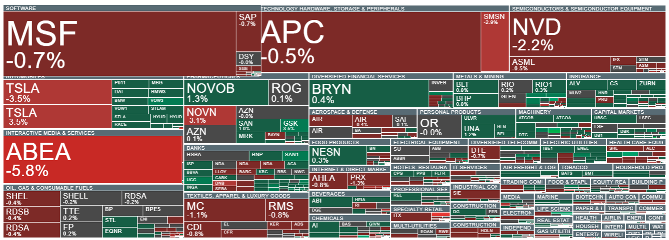 Les sociétés européennes cotées lors de la séance de mercredi se négocient actuellement à des niveaux mixtes. Les ADR américains laissent présager une ouverture en baisse de la séance au comptant aux États-Unis. Source : xStation 5