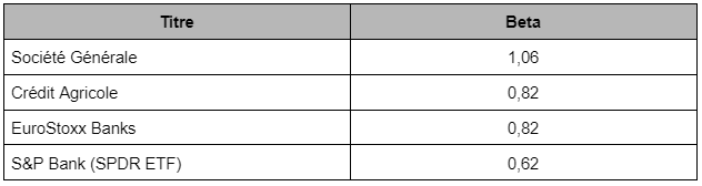 Le tableau suivant nous indique les coefficients par rapport à ses concurrents français et à des paniers de titres représentatifs de ses pairs européens et américains. Le Beta est calculé sur une base journalière, sur une période de 5 ans, avec pour référentiel le cours de BNP Paribas :