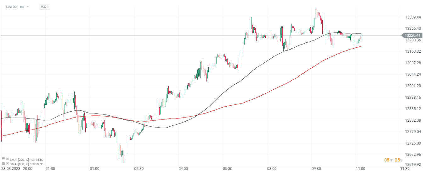 Graphique US100, intervalle M30. Les acheteurs du Nasdaq défendent la SMA200 (ligne rouge) et maintenant, le prix essaie de se maintenir au-dessus de la zone de résistance du SMA100 (ligne noire)) pour prolonger l'élan haussier. Źródło : xStation5