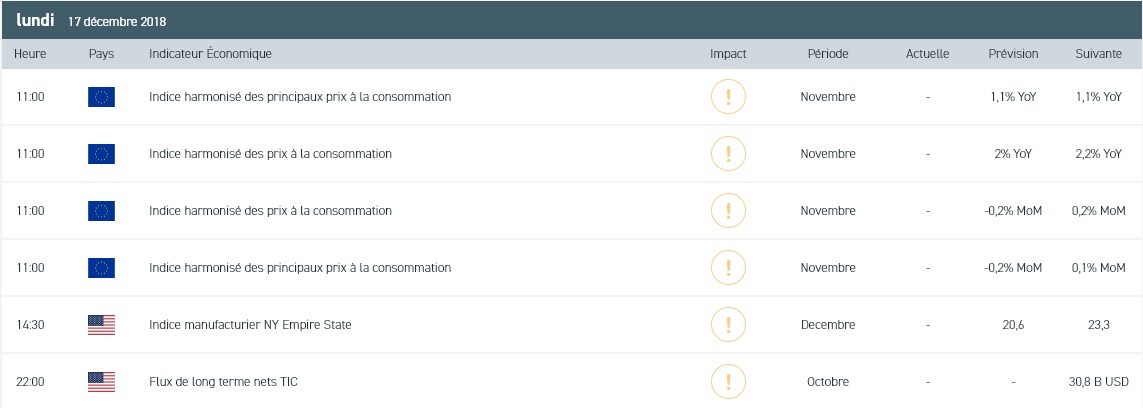 C’est dans un contexte de ralentissement de l’économie mondiale que les membres du FOMC de la Réserve fédérale (Fed) se réuniront cette semaine pour discuter de la politique monétaire. Pour le moment, les investisseurs anticipent une remontée des taux de 25 points de base (25 bps) afin de porter la nouvelle fourchette des « Fed Funds » à 2,25 – 2,50 %. Pour ce lundi, les investisseurs s’intéresseront à la publication de l’indice des prix à la consommation au titre du mois de novembre et à la balance commerciale du mois d’octobre en zone euro. Du côté des Etats-Unis, nous prendrons connaissance de l’indice d’activité Empire-State dans la région de New York du mois de décembre. Pour l’heure, les indices évoluent de manière assez stable. Le DAX 30 (DE30) a ouvert en gap haussier et fluctue autour des 10 853 points. De son côté, l’euro s’inscrit en hausse face au dollar US, autour des 1,1328 $.