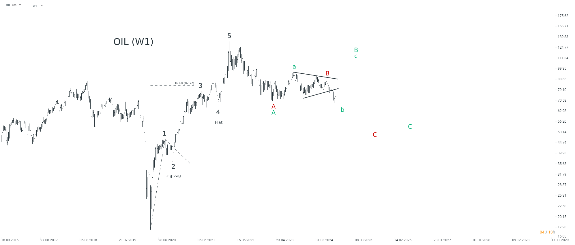 La théorie Elliottiste suggère deux scénarii pour le Brent. Le premier, haussier (en vert), pourrait surprendre les traders avec un rebond violent causé par un événement de marché, envoyant son prix à 100$. Le second, baissier (en rouge), est celui de la récession mondiale qui ferait chuter les prix à environ 50$. Brent en période W1. Source : xStation.
