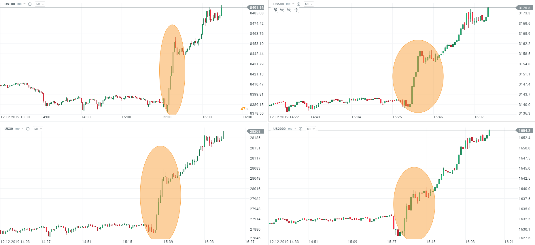 L’explosion haussière sur les indices européens et américains a continué après le tweet de Donald Trump à 15h35 indiquant être très proche d’un accord avec la Chine. Le Wall Street Journal a rapporté que les négociateurs américains auraient proposé de réduire les anciens tarifs douaniers de 50 % sur 360 milliards de dollars de produits chinois. Toujours selon le WSJ, ces mêmes négociateurs auraient également proposé d’annuler les nouveaux tarifs douaniers prévus ce dimanche 15 décembre.