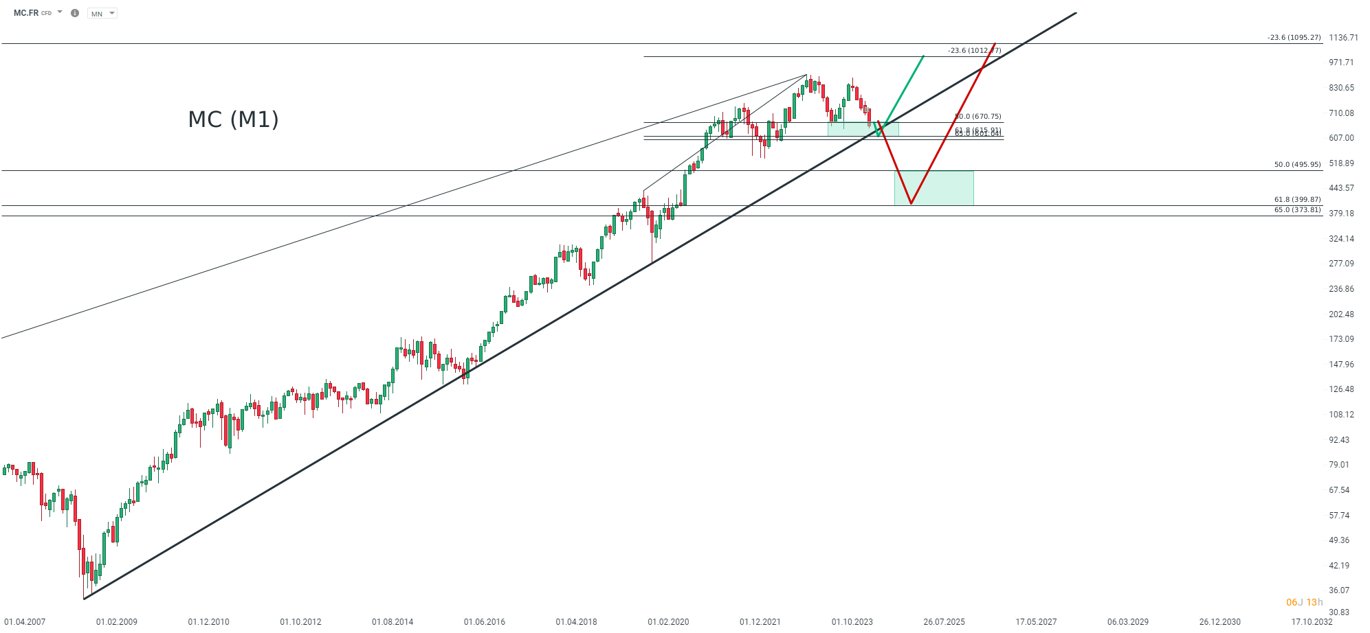 L’action LVMH (MC) s’oriente vers la zone de soutien clé des 600-615 euros, soit une baisse potentielle restante de 6 à 8%. Une cassure baissière de ce support clé serait un signal baissier. La structure technique en Epaule-Tête-Epaule (ETE) pourrait envoyer le titre à des niveaux insoupçonnés il y a quelques semaines, notamment un particulièrement attendu par les institutionnels pour investir, situé à 400 euros. MC en période M1. Source :xStation.
