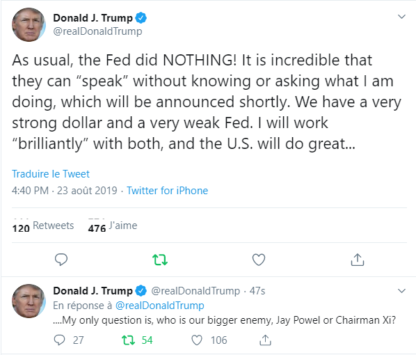 Suite au ton très modéré qu’a décidé d’opter Jerome Powell, Donald Trump n’a pas hésité à tweeter son mécontentement « Comme d'habitude, la Fed n'a rien fait! C'est incroyable qu'ils puissent «parler» sans savoir ni me demander ce que je fais, ce qui sera annoncé sous peu. Nous avons un dollar très fort et une Fed très faible. Je travaillerai «brillamment» avec les deux, et les États-Unis feront très bien. Ma seule question est de savoir qui est notre plus grand ennemi, Jay Powel ou le président Xi? »