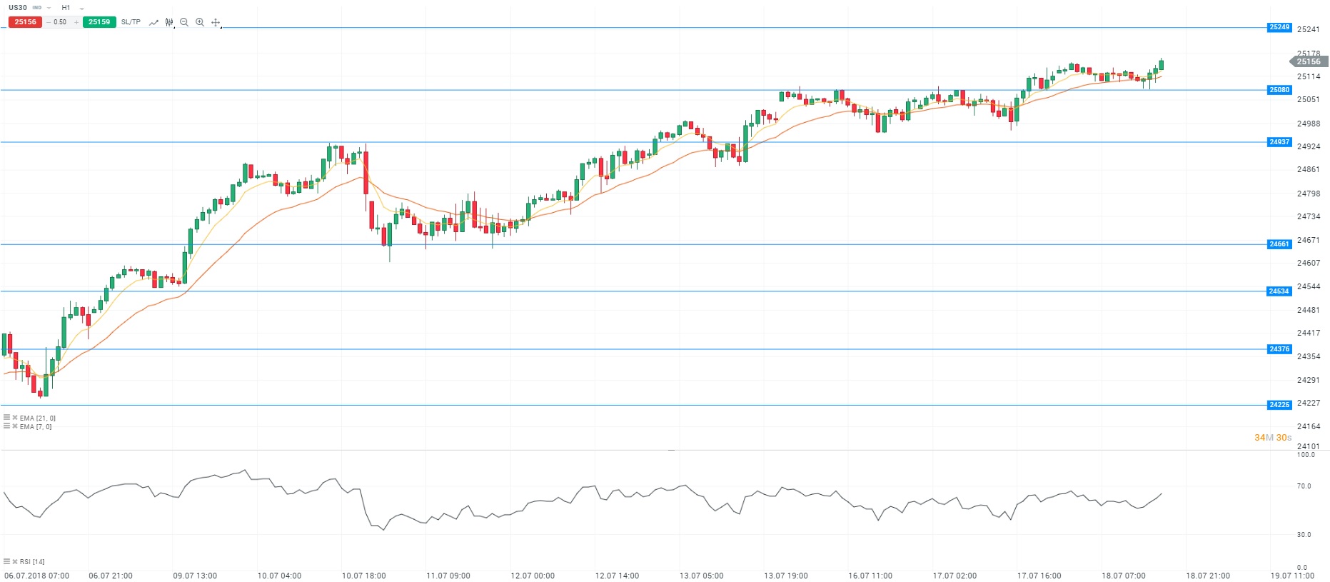 Wall Street a ouvert en ordre dispersé tandis que les opérateurs se tournent vers les résultats trimestriels. Morgan Stanley enregistre la plus forte hausse de l’indice après la publication d’un bénéfice en hausse de 43% au deuxième trimestre. Par ailleurs, Alphabet (Google) est en repli de 0,25% après la sanction de 4,34 milliards d’euros de la Commission européenne pour des « pratiques illégales ». Amazon est porté par le chiffre de ses ventes lors du « Prime Day ». Les opérateurs seront attentifs à la seconde journée d’audition de Jerome Powell, président de la Réserve fédérale (Fed), face à la Chambre des représentants. Enfin, le « Beige book » de la Fed sera publié ce soir à 20h00. Sur un plan technique, les cours oscillent au-dessus de la moyenne mobile courte (à 7 périodes) en unité de temps horaire (H1). Le RSI est orienté à la hausse vers sa zone de surachat. Pour conclure, nous sommes acheteurs avec comme objectif le niveau des 25 249 points.