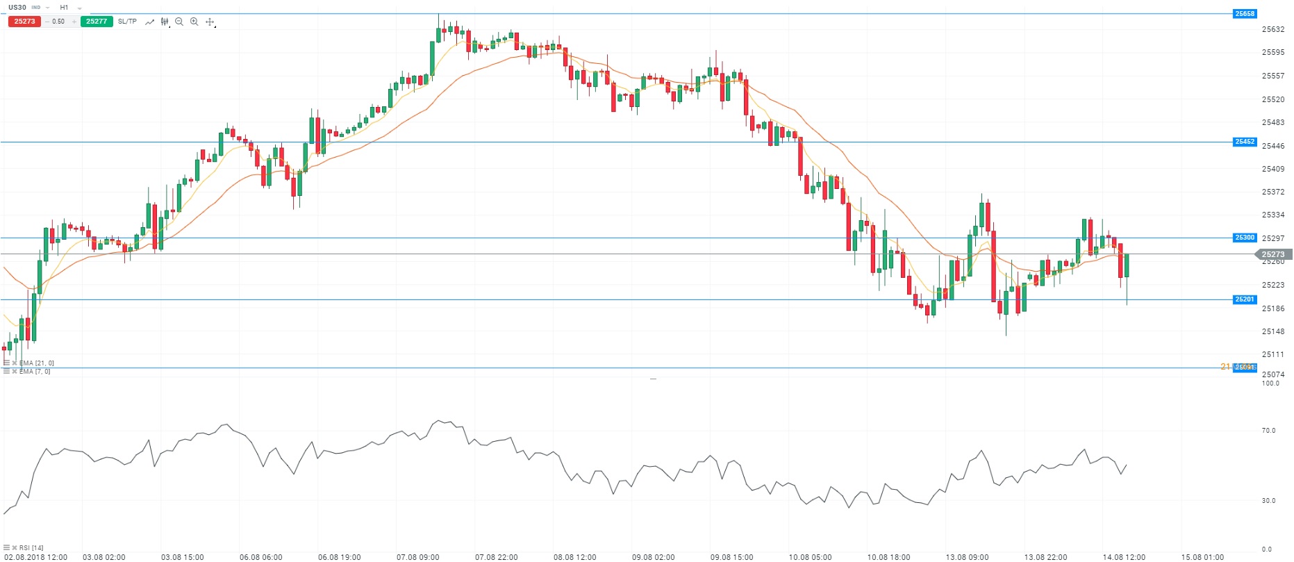 Wall Street a ouvert en territoire positif grâce au rebond de la livre turque sur le marché des changes. La paire USDTRY évolue sur le niveau des 6,52 livres pour un dollar après avoir atteint le seuil des 7 livres dimanche. Dans le même temps, Recep Tayyip Erdogan, président de la Turquie, a appelé au boycott de certains appareils électroniques américains comme les produits Apple. Jeudi, une conférence téléphonique se tiendra entre le ministre turc des Finances et des investisseurs étrangers. Les valeurs de l’énergie sont soutenues par la hausse des cours du pétrole, à l’image de Chevron et Exxon Mobil. Home Depot recule malgré des résultats du deuxième trimestre supérieurs aux attentes du consensus et un relèvement de sa prévision pour l’année 2018-2019. Enfin, sur le marché des changes, la paire EURUSD évolue sous le niveau de 1,40$. Sur le plan technique, les cours oscillent autour des moyennes mobiles (à 7 et 21 périodes) en unité de temps horaire (H1). Le RSI est orienté à la hausse autour de sa zone de neutralité. Pour conclure, nous sommes acheteurs avec comme objectif le niveau des 25 300 points.