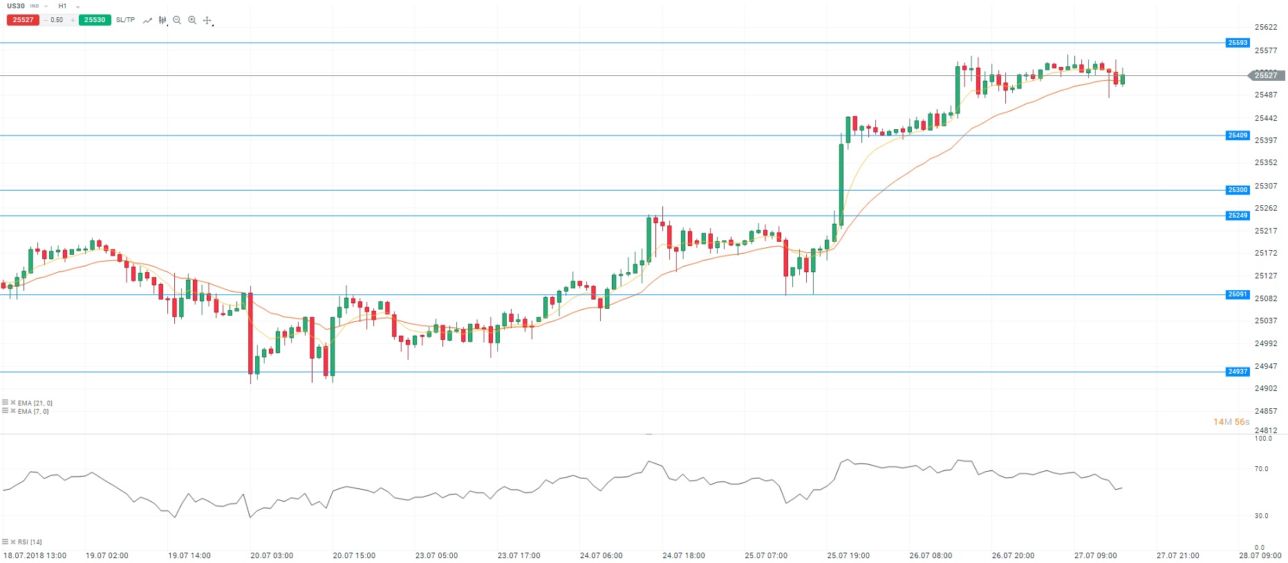 Wall Street évolue en ordre dispersé après de nombreuses publications d’entreprises. Pour l’heure, le secteur technologique bénéficie des résultats d’Amazon qui a franchi un nouveau cap en Bourse. En effet, l’entreprise de Jeff Bezos a annoncé un bénéfice trimestriel record. A l’opposé, Twitter recule de près de 16% suite à de mauvais résultats. Par ailleurs, l’indice est freiné par Intel et Exxon Mobil. En outre, le département américain au Commerce a confirmé l’accélération de la croissance au deuxième trimestre. Ainsi, le PIB a progressé de 4,1%, en données prévisionnelles, soit la plus forte hausse depuis 2014. Enfin, on note une dégradation plus faible que prévue du moral des ménages américains en juillet, d’après l’enquête mensuelle de l’Université du Michigan. Sur le marché des changes, la paire EURUSD est repassée au-dessus du niveau de 1,1650$ pour un euro. Concernant l’analyse technique, les cours fluctuent autour de la moyenne mobile courte (à 7 périodes) en unité de temps horaire (H1). Le RSI est orienté à la baisse autour de sa zone de neutralité. Ces éléments nous conduisent à avoir une préférence à la vente avec pour objectif le niveau des 25 409 points.