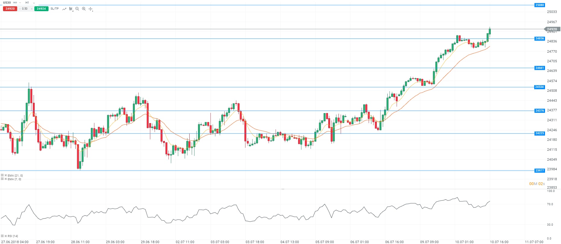 Les indices américains ont ouvert mardi en territoire positif. La première séance de la semaine a été marquée par la bonne performance du secteur bancaire. Et pour cause, JPMorgan, Citigroup et Wells Fargo publieront vendredi leurs résultats du deuxième trimestre. Pour l’heure, Pepsico progresse de 2,81% suite à la publication de ses résultats trimestriels qui sont ressortis au-dessus des attentes du consensus. En outre, le secteur de l’énergie est soutenu par la hausse des cours du pétrole à l’image de Chevron et Exxon Mobil. Sur le marché des changes, on note un regain du dollar tandis que la paire EURUSD se stabilise sur le niveau des 1,1715$ pour un euro. Sur un plan technique, les cours oscillent au-dessus des moyennes mobiles (à 7 et 21 périodes) en unité de temps horaire (H1). Le RSI est orienté à la hausse dans sa zone de neutralité. Pour conclure, nous sommes acheteurs avec comme objectif le niveau des 25 080 points.