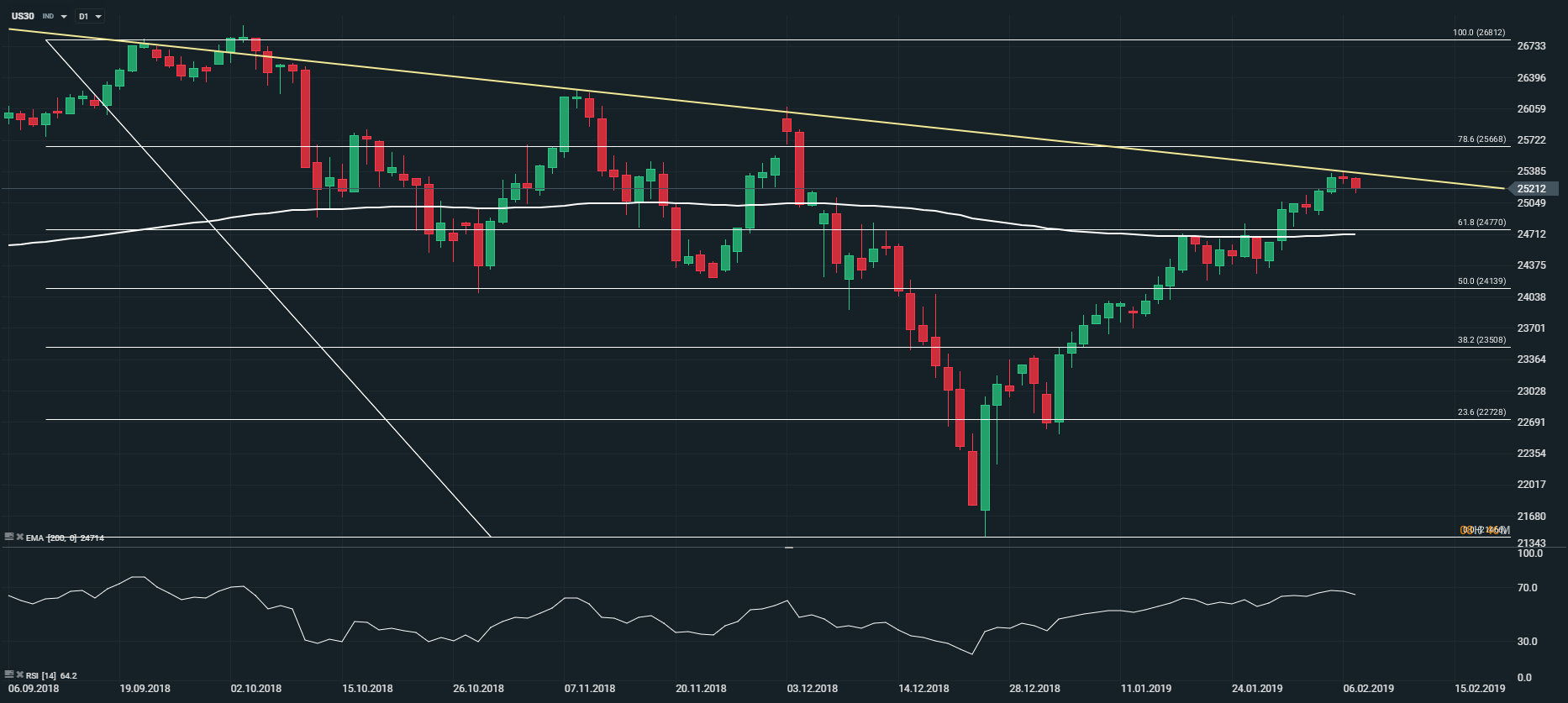 Sur le plan technique, l’indice Dow Jones 30 (DJIA30) évolue en tendance haussière en unité de temps journalière (D1). En effet, nous observons sur le graphique ci-dessus que les prix sont soutenus depuis plusieurs jours par la moyenne mobile à 200 périodes. Toutefois, nous remarquons que le marché donne des signaux de faiblesse à court terme car les prix n’ont pas réussi à s’affranchir de la résistance oblique et le RSI semble se replier à l’approche de sa zone de surachat. Dans un tel contexte, nous conservons un biais prudent sur le DJIA30 à court terme.