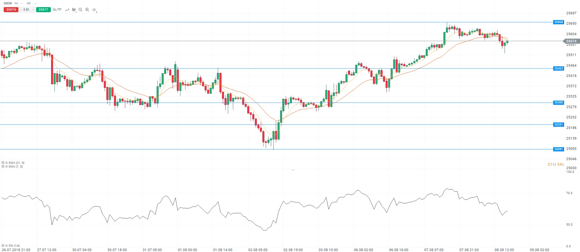 Les indices américains ont ouvert en légère baisse après que la Chine ait décidé de répondre de manière équivalente aux droits de douane américains. En effet, des mesures tarifaires entreront en vigueur à partir du 23 août et porteront sur 333 produits américains, d’une valeur totale de 16 milliards de dollars. Du côté des valeurs, Walt Disney perd 1,45% et signe la plus forte baisse de l’indice en raison du mauvais chiffre de son bénéfice trimestriel. Enfin, sur le marché des changes, l’euro retrouve des couleurs alors que la paire EURUSD est repassé au-dessus du seuil de 1,16$. Le rendement de l’obligation américaine de maturité dix ans se stabilise au niveau de 2,96%. Concernant l’analyse technique, les cours fluctuent autour de la moyenne mobile courte (à 7 périodes) en unité de temps horaire (H1). Le RSI est orienté à la hausse autour de sa zone de neutralité. Ces éléments nous conduisent à avoir une préférence à l’achat avec pour objectif le niveau des 25 658 points.