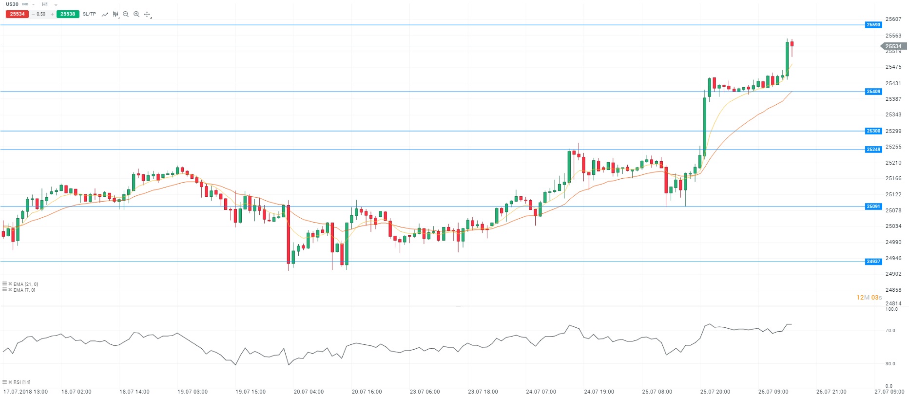 Wall Street a ouvert en ordre dispersé en raison de la chute de Facebook. En effet, le Nasdaq est pénalisé par les inquiétudes sur le chiffre d’affaires et les dépenses du géant américain. La valeur perd 18% à l’ouverture et pourrait perdre près de 100 milliards de capitalisation boursière. Cependant, l’apaisement des tensions commerciales est profitable au Dow Jones 30. Sur le marché des changes, la paire EURUSD poursuit sa baisse vers le niveau de 1,1650$ pour un euro. D’un point de vue technique, les cours évoluent au-dessus des moyennes mobiles (à 7 et 21 périodes) en unité de temps horaire (H1). Le RSI est stable dans sa zone de surachat. En conclusion, nous avons un biais acheteur avec comme objectif le niveau des 25 593 points.