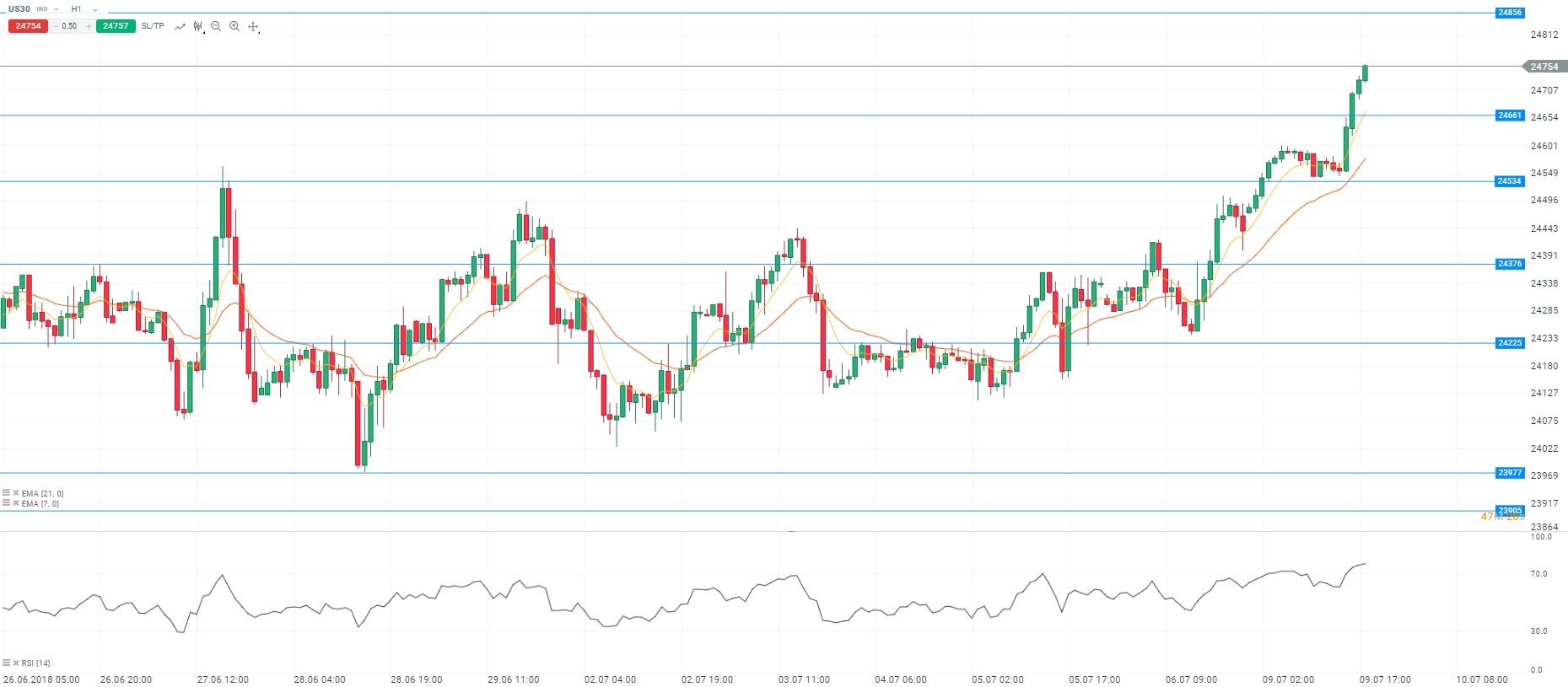Wall Street a ouvert en territoire positif dans le sillage des indices asiatiques et européens. Les Bourses américaines continuent de bénéficier des bons chiffres relatifs au marché de l’emploi aux Etats-Unis publiés vendredi. Par ailleurs, l’entrée en vigueur, vendredi, des droits de douanes réciproques de 34 milliards de dollars par les Etats-Unis et la Chine ne semble pas peser sur les cours. Du côté des valeurs, les entreprises spécialisées dans la fabrication de semi-conducteurs progressent malgré les tensions commerciales. Cette semaine, les investisseurs seront focalisés sur l’ouverture de la saison des résultats trimestriels du second trimestre. Les valeurs bancaires seront à l’honneur vendredi avec JPMorgan, Wells Fargo et Citigroup. Sur le marché obligataire, l’obligation américaine de maturité dix ans est en hausse sur le niveau des 2,85%. Enfin, le dollar est en repli face à l’euro en raison de la publication de bonnes statistiques en Allemagne. Sur un plan technique, les cours oscillent au-dessus des moyennes mobiles (à 7 et 21 périodes) en unité de temps horaire (H1). Le RSI est orienté à la hausse dans sa zone de surachat. Pour conclure, nous sommes acheteurs avec comme objectif le niveau des 24 856 points.