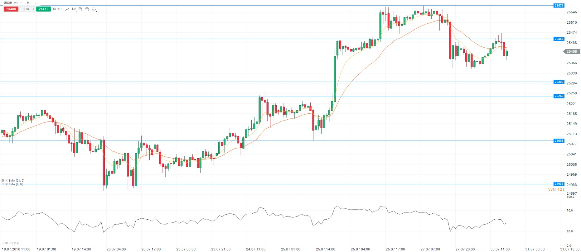 Les déceptions s’accumulent au sein des valeurs technologiques. En effet, Facebook, Intel et Twitter pénalisent le Nasdaq et le secteur technologique en général. Des craintes apparaissent chez les investisseurs quant aux publications à venir (notamment Apple mardi) et aux perspectives du secteur. Caterpillar a relevé sa prévision de bénéfice pour cette année et progresse de 1%. La prudence reste de mise avant la réunion de politique monétaire de la Réserve fédérale (Fed). Enfin, nous faisons état d’une augmentation inattendue des promesses de ventes de logements en juin aux Etats-Unis. Sur un plan technique, les cours oscillent sous les moyennes mobiles (à 7 et 21 périodes) en unité de temps horaire (H1). Le RSI est orienté à la baisse autour de sa zone de neutralité. Pour conclure, nous sommes vendeurs avec comme objectif le niveau des 25 300 points.