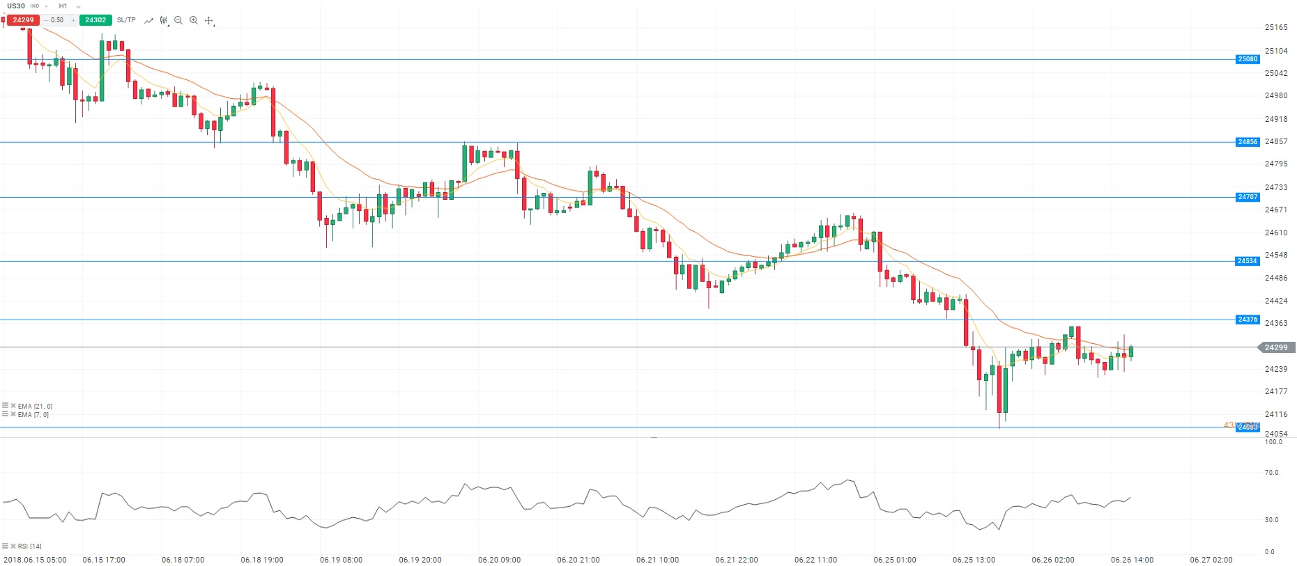 Wall Street a ouvert en territoire positif en dépit de la persistance des tensions commerciales. En effet, le département du Trésor américain devrait apporter davantage de précisions sur les restrictions relatives aux investissements chinois dans des entreprises américaines stratégiques. Pour rappel, les droits de douane de 25% portant sur 50 milliards de dollars de produits chinois entreront en vigueur le 6 juillet. Du côté des valeurs, General Electric sort de la cote à ce jour sur une note positive avec un gain de 6,98%. Sur le marché obligataire, le rendement de l’obligation américaine de maturité dix ans se stabilise au niveau des 2,87%. Sur un plan technique, les cours fluctuent autour de la moyenne mobile courte (à 7 périodes) en unité de temps horaire (H1). Le RSI est stable dans sa zone de neutralité. Pour conclure, nous sommes acheteurs avec comme objectif le niveau des 24 376 points.
