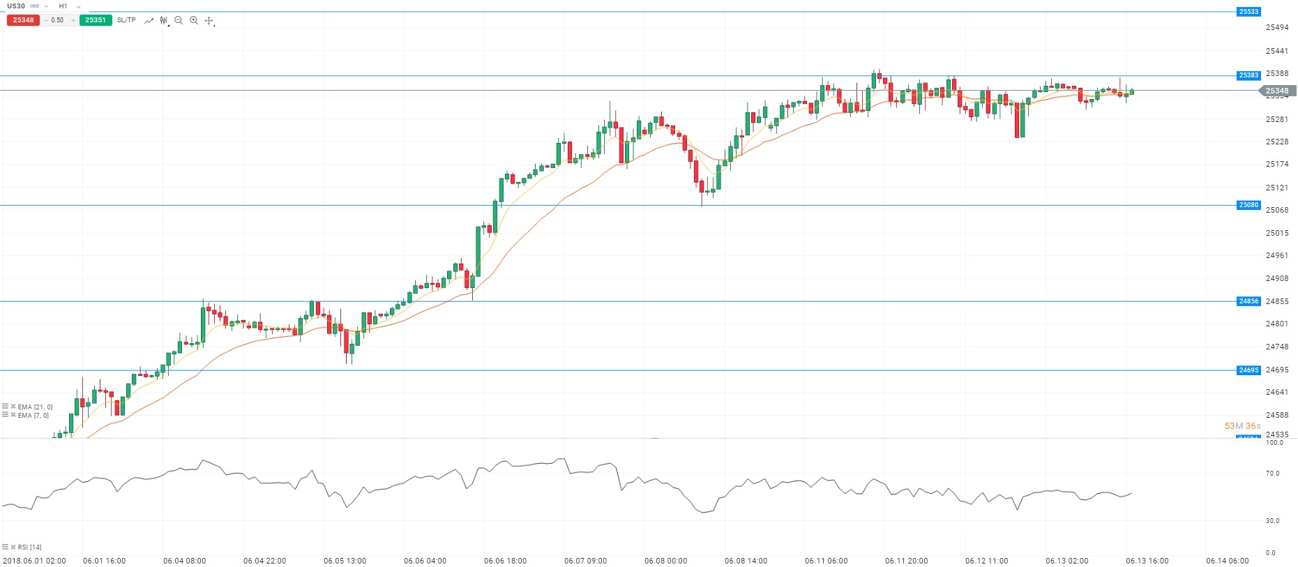 Au moment où nous écrivons ces lignes, les indices américains ont ouvert dans le vert dans l’attente de la décision sur les taux de la Réserve fédérale (Fed). Pour rappel, le consensus table sur un second relèvement des taux d’intérêt qui porterait le taux des « Fed Funds » dans la fourchette 1,75%-2%. De plus, les opérateurs seront attentifs aux « dots plots » et à la déclaration de Jerome Powell (président de la Fed) afin d’identifier les indices sur le rythme des hausses de taux à venir. Par ailleurs, le département du Travail a fait état d’une progression des prix à la production au mois de mai aux Etats-Unis. Sur le marché des changes, le dollar perd du terrain tandis que la paire EURUSD progresse sur le niveau de 1,1770$. D’un point de vue technique, les cours évoluent autour des moyennes mobiles (à 7 et 21 périodes) en unité de temps horaire (H1). Le RSI est stable autour de sa zone de neutralité. En conclusion, nous avons un biais neutre en attendant la Fed.