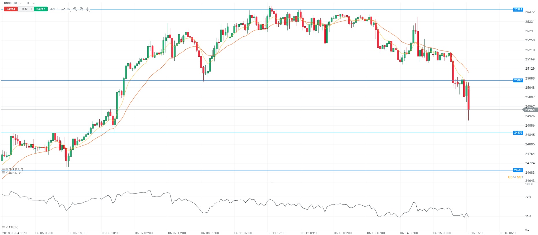 Wall Street a ouvert en baisse dans le sillage des indices européens en raison du retour des tensions commerciales. C’est ainsi que Donald Trump a annoncé des droits de douane de 25% sur les importations de produits chinois, en particulier les produits du secteur technologique. Ces produits sont valorisés à 50 milliards de dollars. En réponse, le ministère chinois du Commerce a affirmé qu’une réplique de même « ampleur et d’une intensité similaires » est à prévoir. Sur le marché des changes, l’euro retrouve un peu de couleurs après la forte chute observée jeudi après l’intervention de la Banque centrale européenne (BCE). Dans le même temps, l’obligation américaine de maturité dix ans recule sur le niveau des 2,897%. Sur un plan technique, les cours oscillent sous les moyennes mobiles (à 7 et 21 périodes) en unité de temps horaire (H1). Le RSI est stable proche de sa zone de surventes. Pour conclure, nous sommes vendeurs avec comme objectif le niveau des 24 856 points.