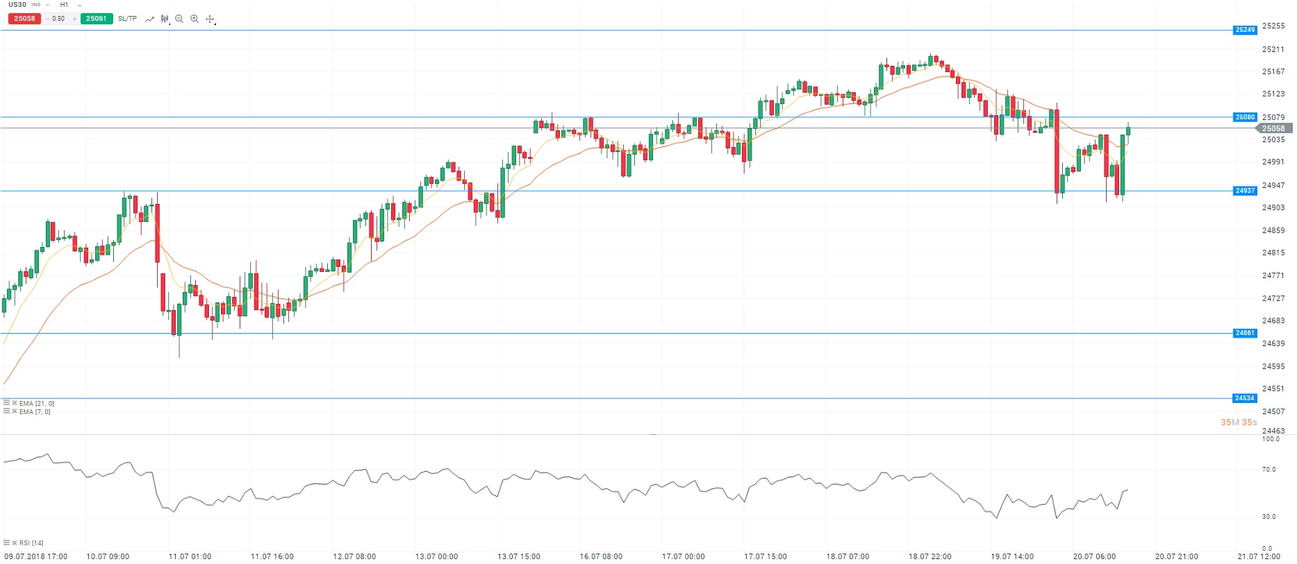Les indices américains évoluent sur une note instable après les propos de Donald Trump. La séance est clairement dépendante du président américain. Sur le front commercial, ce dernier s’est dit prêt à imposer 500 milliards de dollars de droits de douane sur les importations en provenance de Chine. Dans le même temps, Donald Trump a réitéré ses critiques envers la politique monétaire de la Réserve fédérale (Fed), en particulier le rythme de relèvement des taux d’intérêt. Du côté des valeurs, Microsoft a publié de bons résultats trimestriels et soutien donc l’indice Nasdaq. A l’inverse, General Electric recule de 3,06% après avoir revu à la baisse son bénéfice pour le deuxième trimestre. D’un point de vue technique, les cours évoluent au-dessus de la moyenne mobile courte (à 7 périodes) en unité de temps horaire (H1). Le RSI est orienté à la hausse autour de sa zone de neutralité. En conclusion, nous avons un biais acheteur avec comme objectif le niveau des 25 080 points.